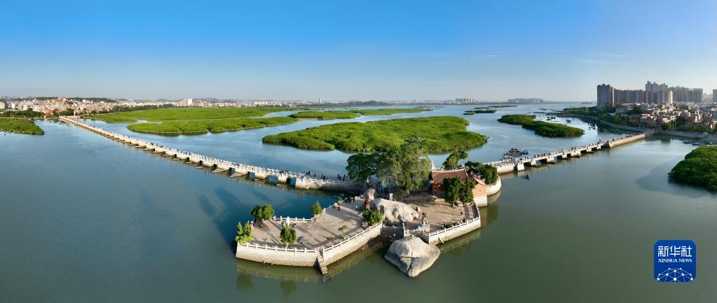 泉州洛阳桥(无人机全景照片,11月19日摄)。洛阳桥位于泉州市区东北部的洛阳江上,原名“万安桥”,始建于北宋皇祐五年至嘉祐四年(1053-1059年),为我国现存最早的跨海梁式大石桥,代表当时中国先进的造桥技术。