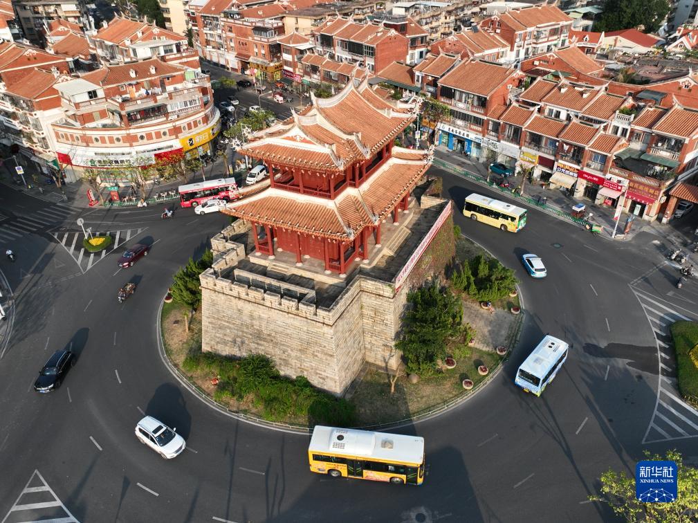 泉州朝天门(无人机照片,11月7日摄)。朝天门为泉州古代七城门之一,城楼为歇山式单檐木结构建筑,气势宏伟,周围建筑古色古香。