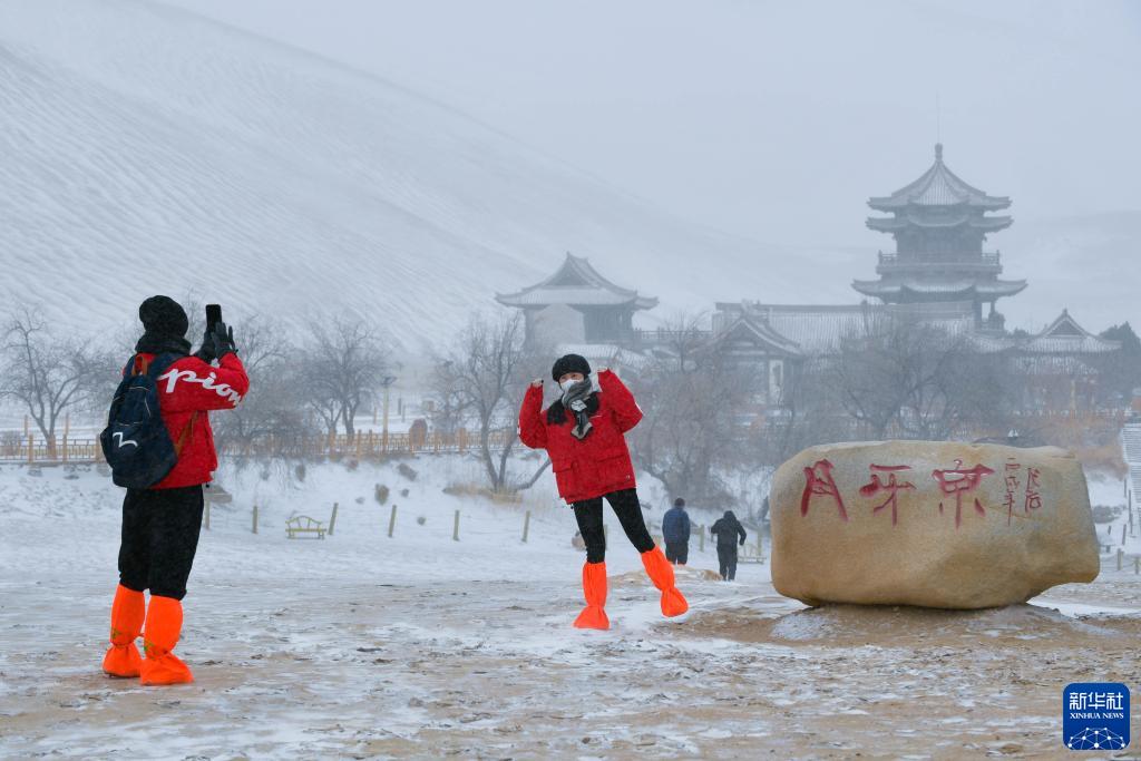 游客在甘肃省敦煌市鸣沙山月牙泉景区拍照(12月14日摄)。