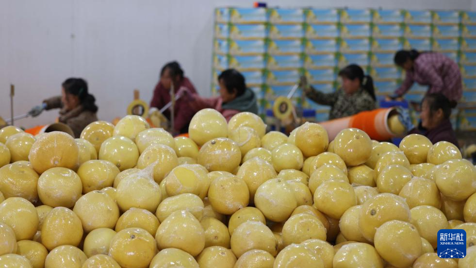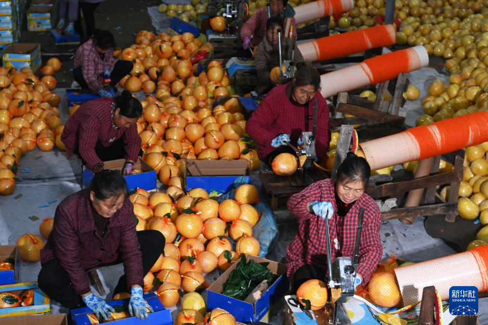 1月8日,在岑巩县注溪镇周坪村果树种植专业合作社,村民在包装柚子。