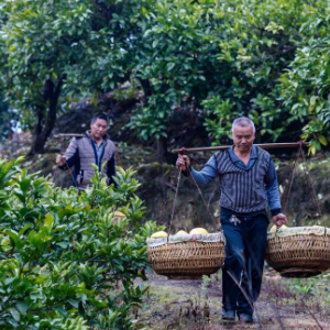 1月8日,在岑巩县注溪镇周坪村思州柚种植基地,村民在挑运柚子。