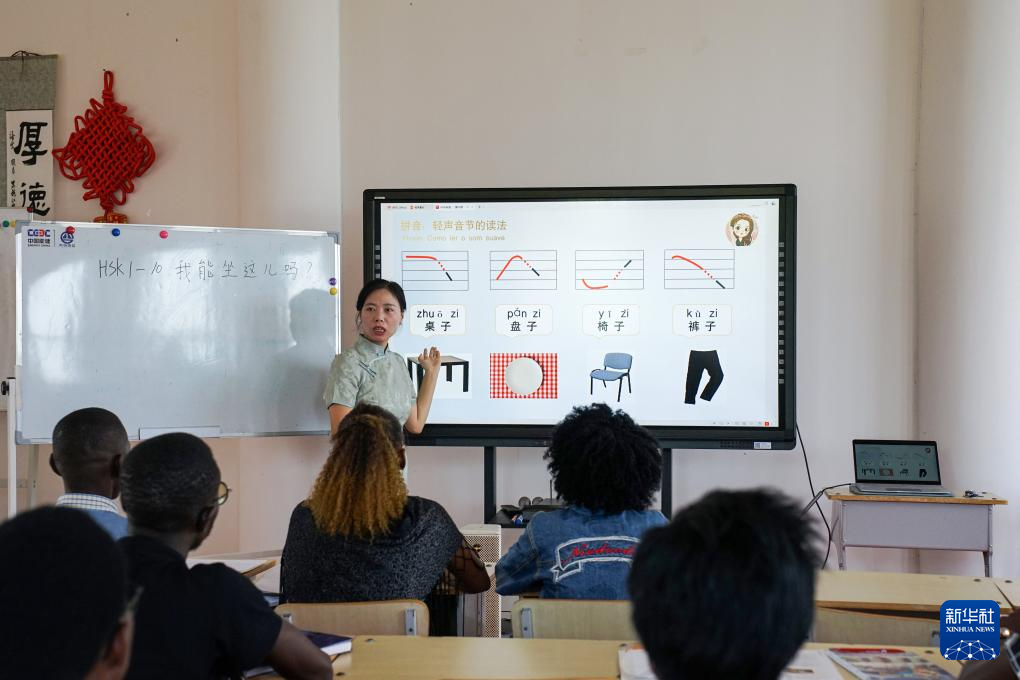 3月6日,在安哥拉首都罗安达,内图大学孔子学院教师孙云为学生们讲授中文。