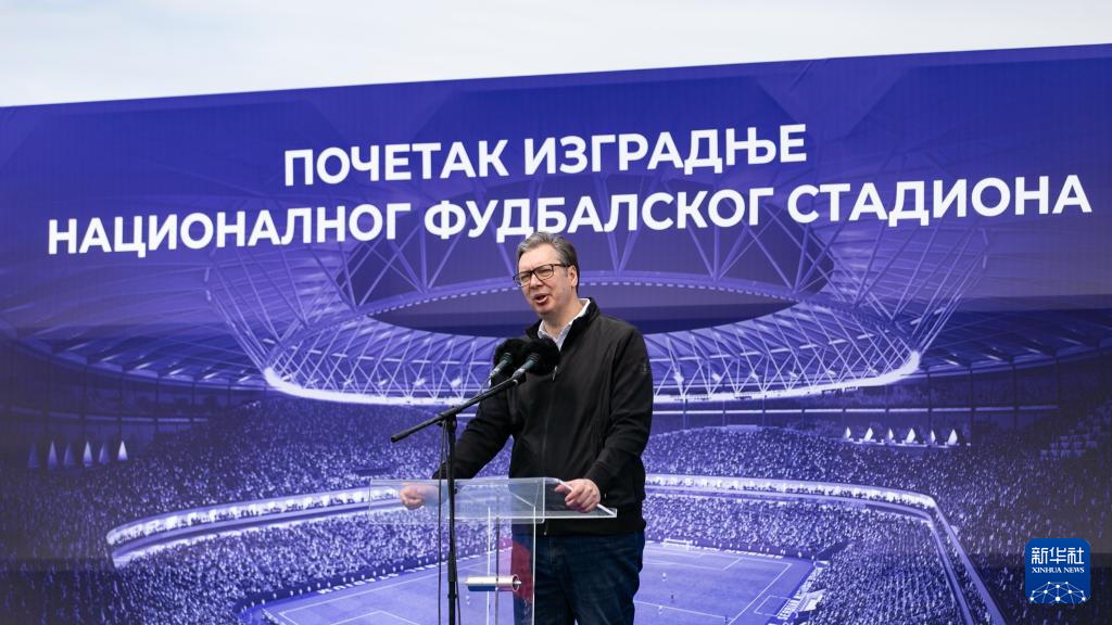 5月1日,在塞尔维亚贝尔格莱德举行的塞尔维亚国家足球体育场项目奠基仪式上,塞尔维亚总统武契奇(中)观看展板。