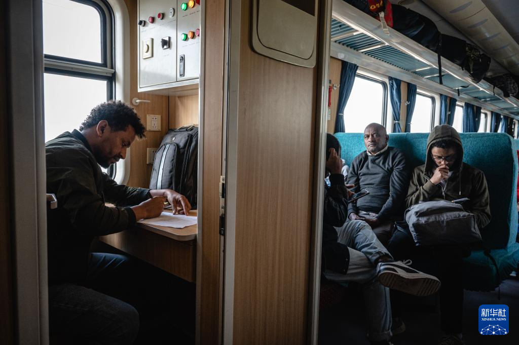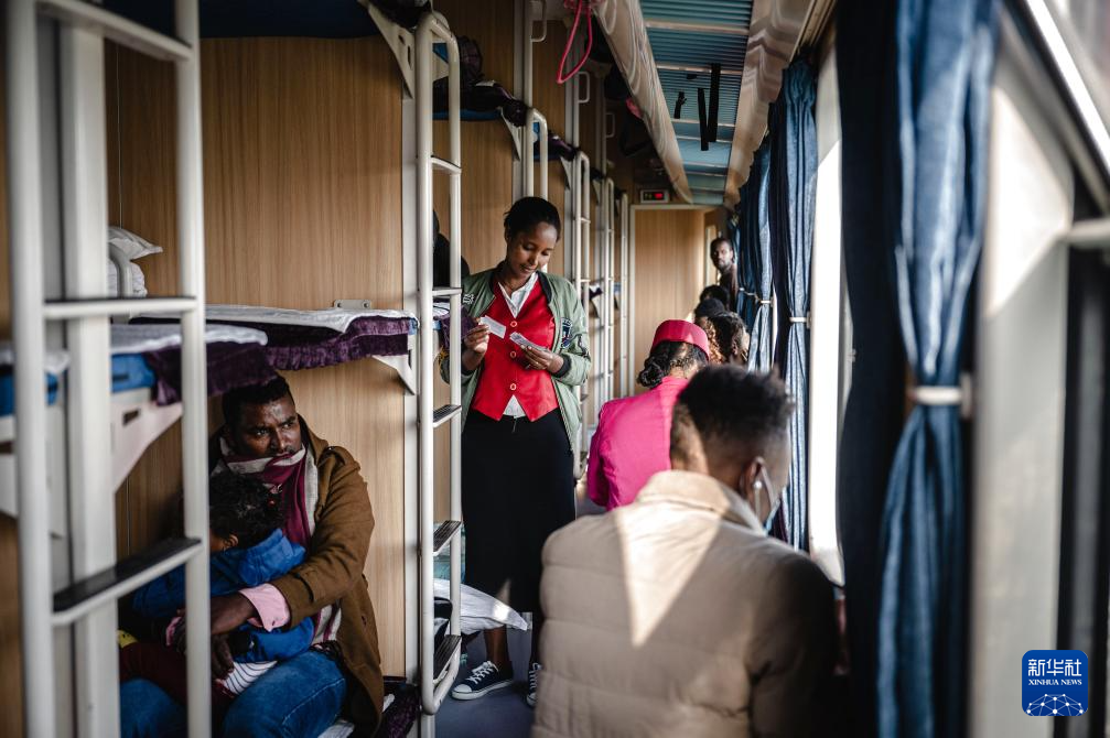 2023年9月9日,列车员在亚吉铁路列车的车厢内查票。