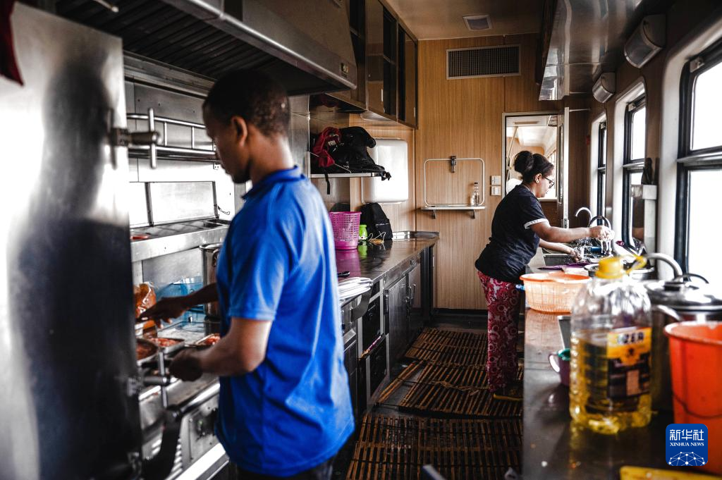 2023年9月9日,工作人员在亚吉铁路列车上准备餐食。