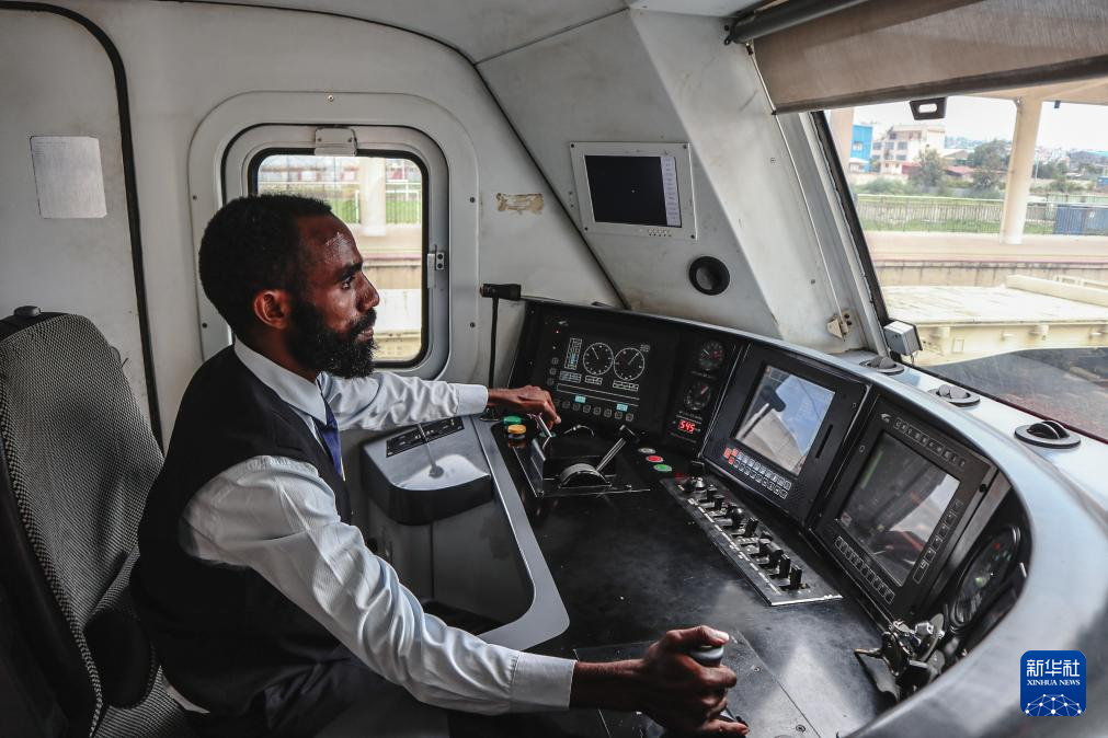 2024年5月10日,埃塞俄比亚火车司机在亚吉铁路列车的驾驶室里工作。