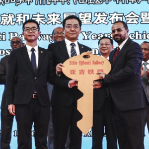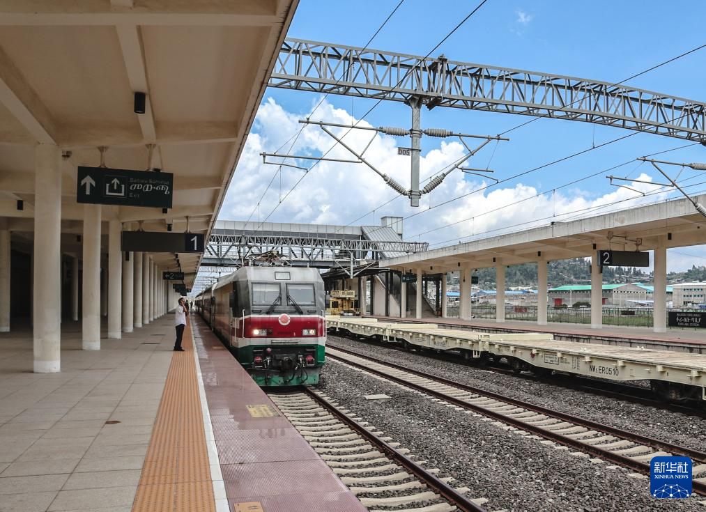 2024年5月10日,在埃塞俄比亚首都亚的斯亚贝巴拉布火车站,亚吉铁路中方联营公司负责人与当地业主负责人举行“交钥匙”仪式。