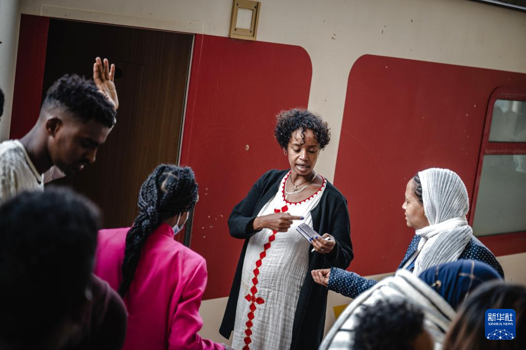 2023年9月9日,工作人员在埃塞俄比亚首都亚的斯亚贝巴拉布火车站为乘客检票。