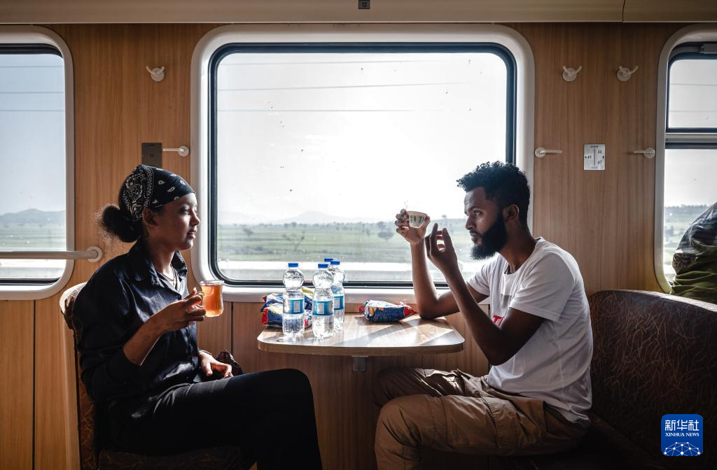 2023年9月9日,乘客在亚吉铁路列车的餐车内交谈。