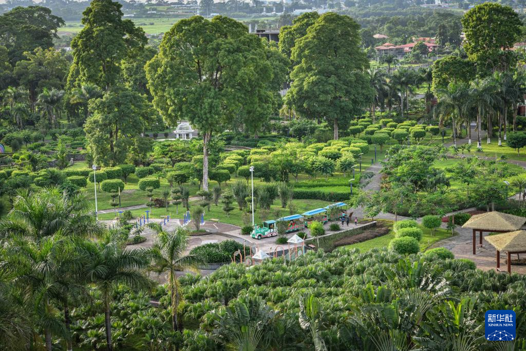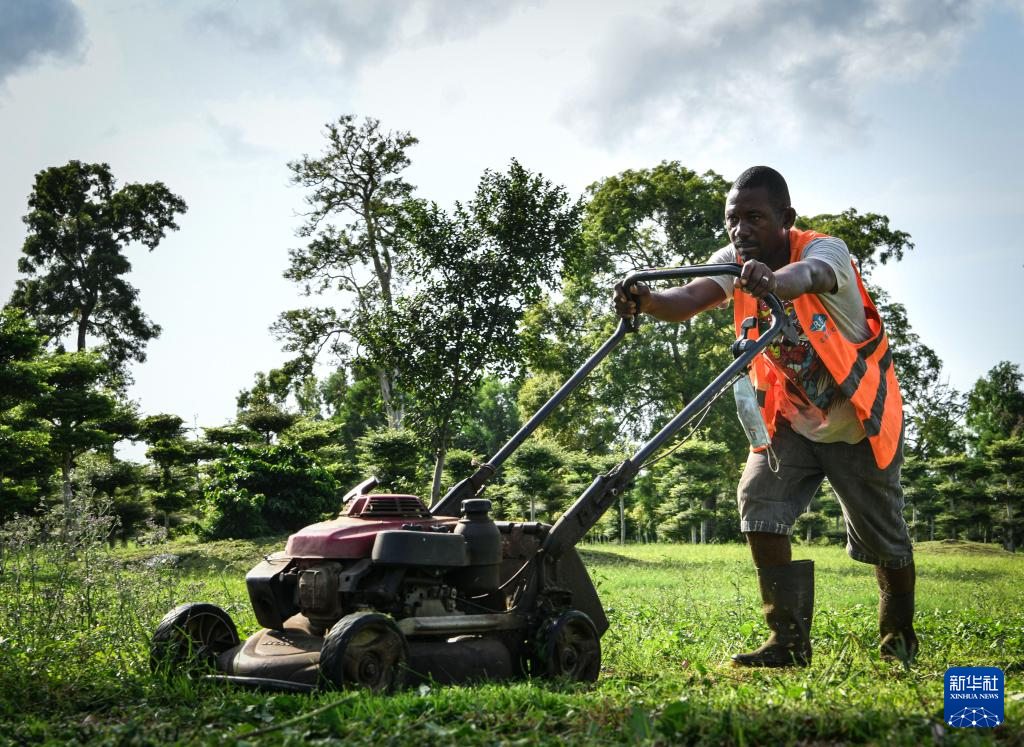 5月18日,在赤道几内亚首都马拉博,39岁的园丁沃约维诺·奥比昂在马拉博国家公园除草。沃约维诺2015年进入中国路桥任职,目前带领一支园丁小队负责公园的维护养护工作。