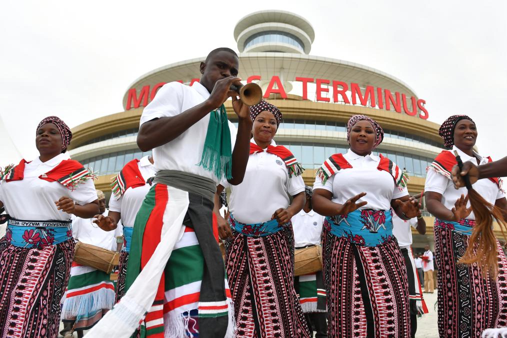 2017年5月31日,蒙内铁路建成通车。首班客运列车抵达内罗毕南站后,车站广场上的人们跳起民族舞蹈,现场犹如欢乐的海洋。