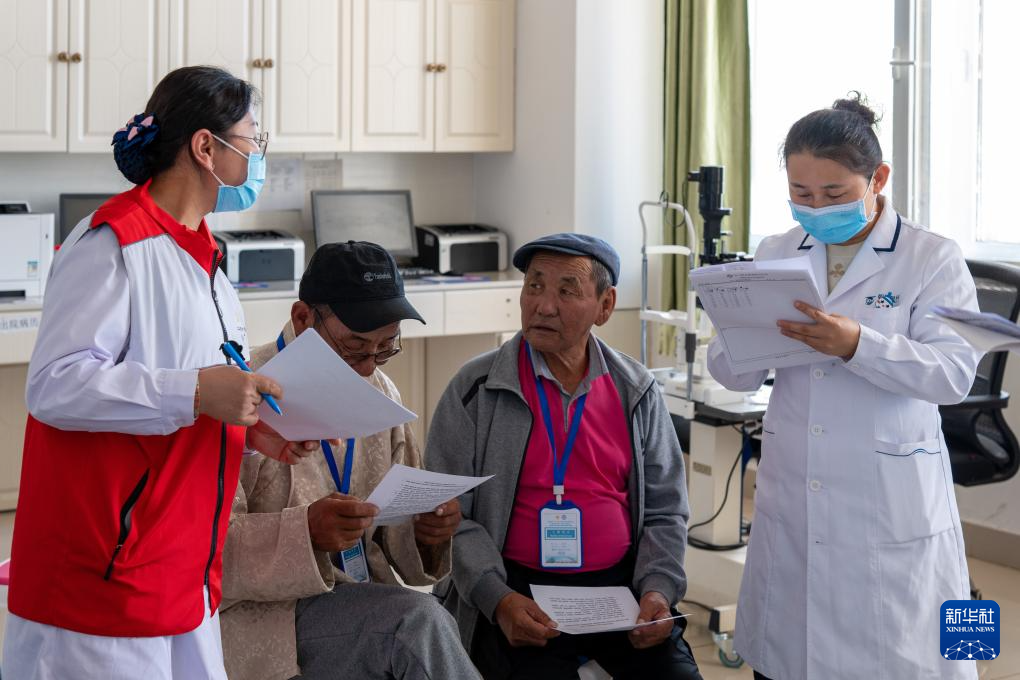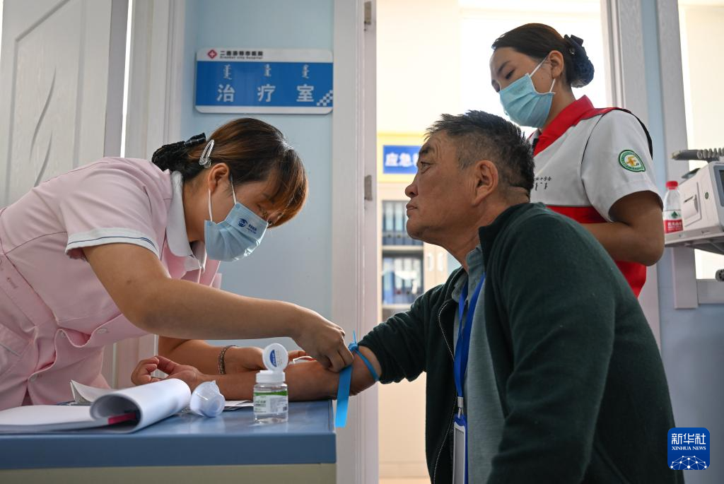 9月9日,在二连浩特市人民医院,护士(左一)为患者进行术前采血。
