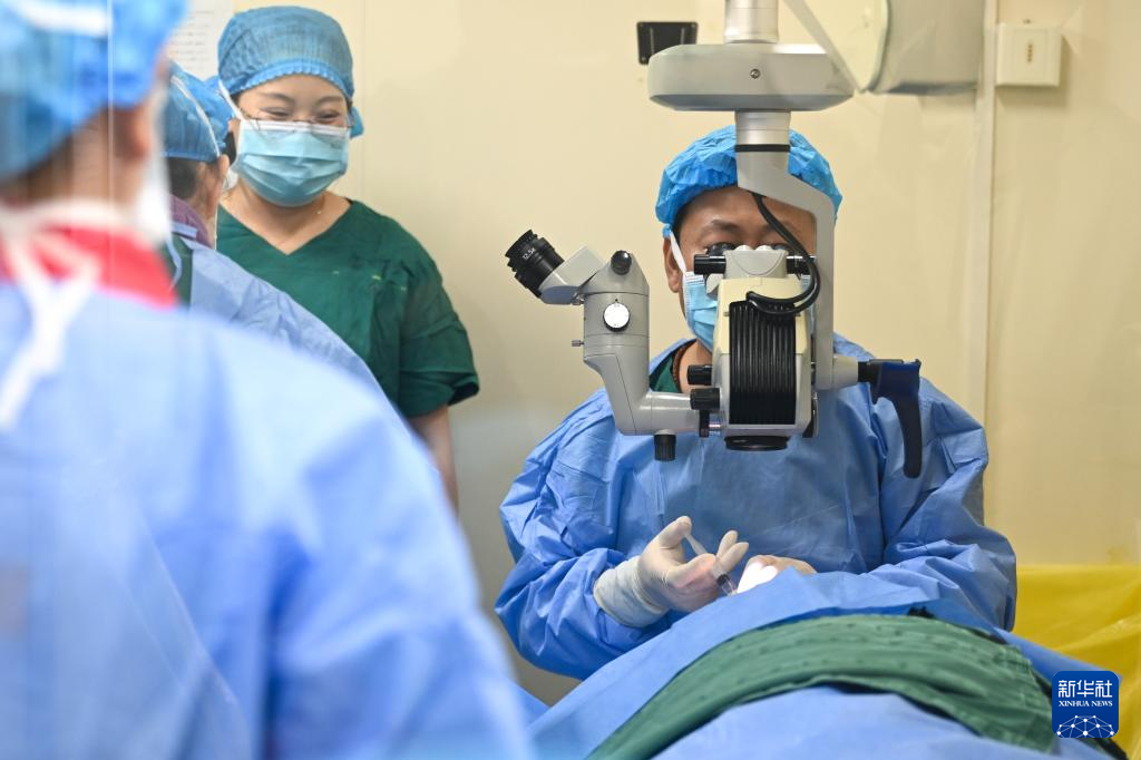 9月10日,内蒙古朝聚眼科医院医生(右一)在流动复明手术车内为患者进行手术。