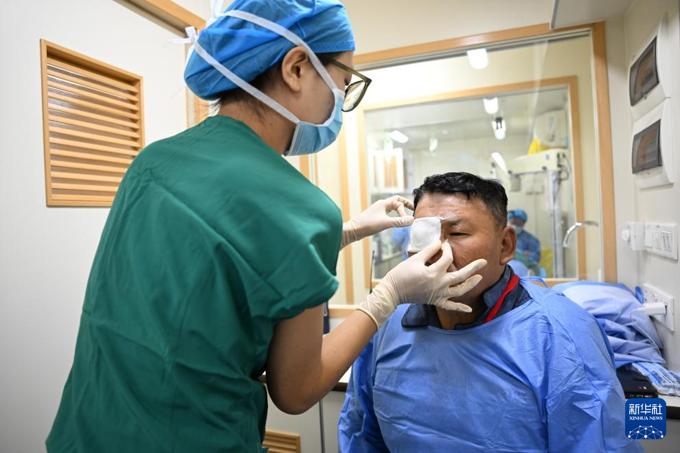 9月10日,护士(左)在流动复明手术车内为术后患者粘贴纱布。