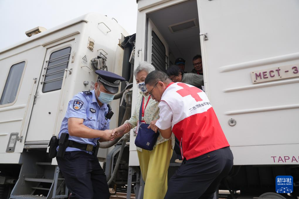 9月9日,二连出入境边防检查站移民管理警察(左)和二连浩特市红十字会工作人员(右)在二连浩特市铁路口岸协助蒙古国患者下车。