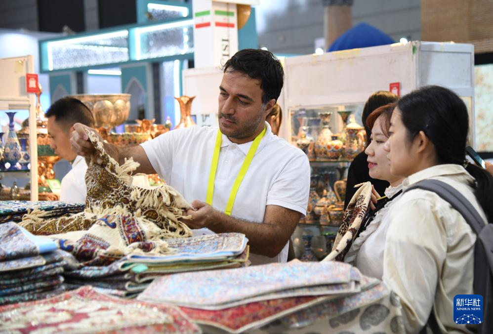 9月20日,来自伊朗的参展商(右一)向观众介绍产品。