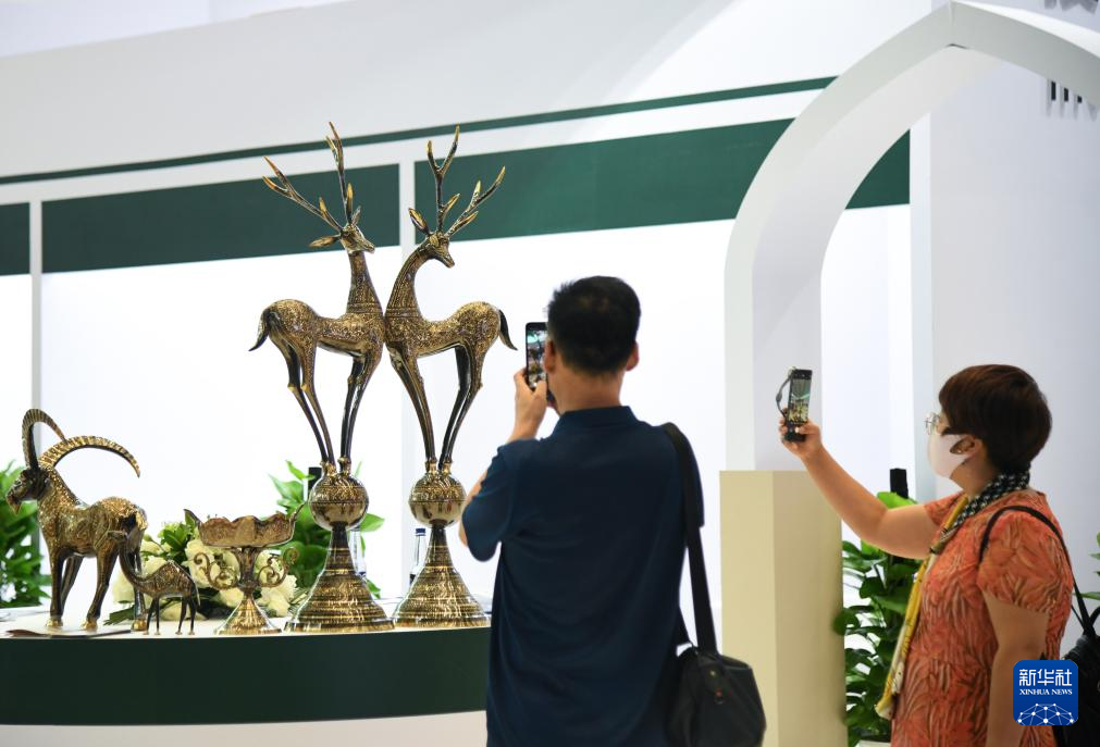 9月20日,观众在巴基斯坦展位参观工艺品。