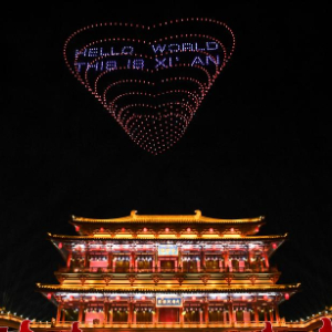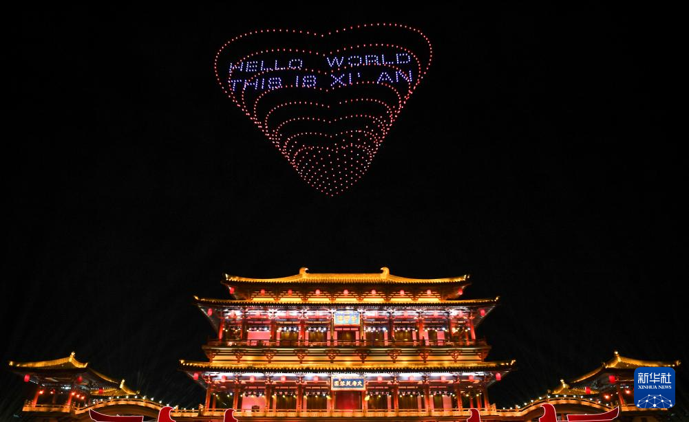 9月21日,第十一届丝绸之路国际电影节开幕式现场的无人机表演秀。