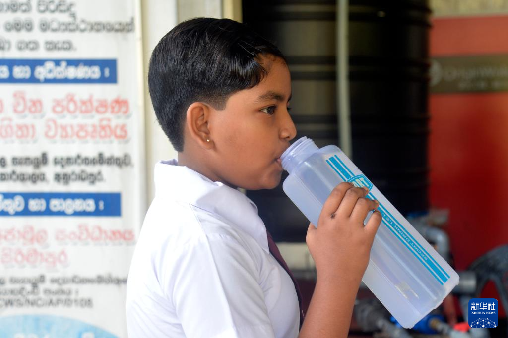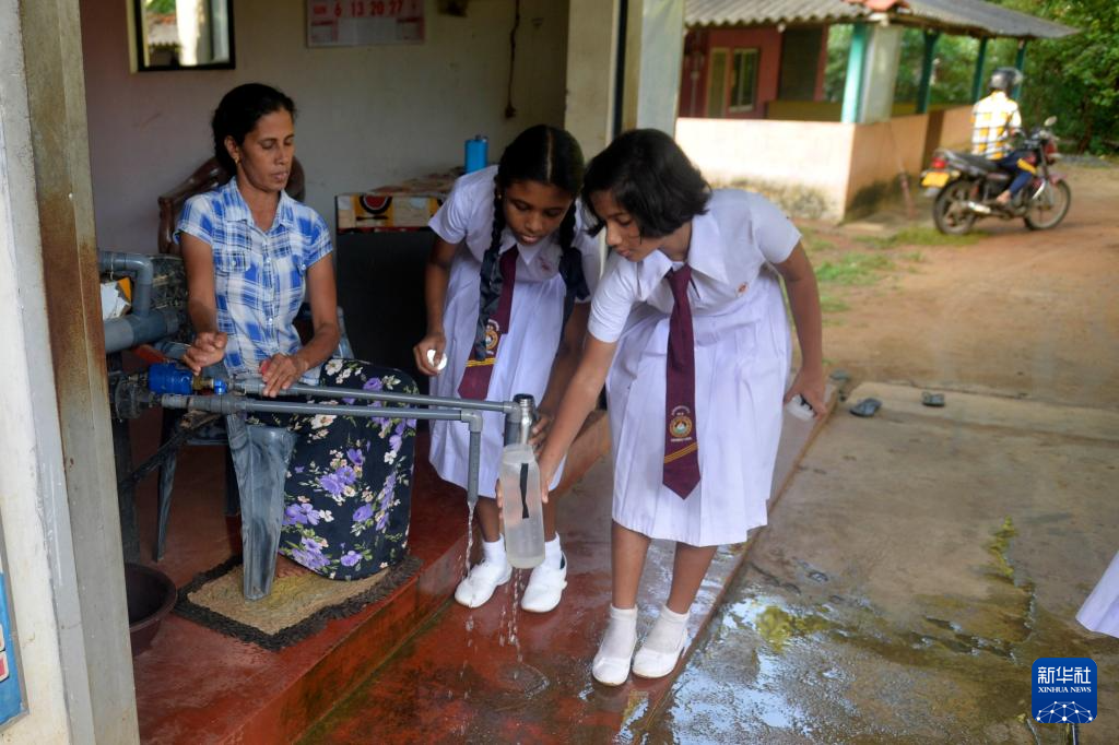 10月2日,在斯里兰卡中北部地区尼迪亚村,学生正在中国援建的饮用水装置旁饮水。新华社发(加扬·萨米拉摄)