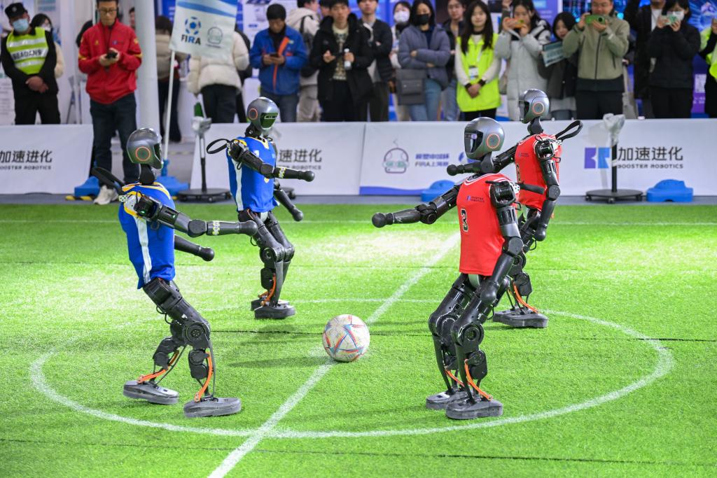 2月21日,机器人在2025全球开发者先锋大会现场踢足球。 新华社发(陈浩明 摄)