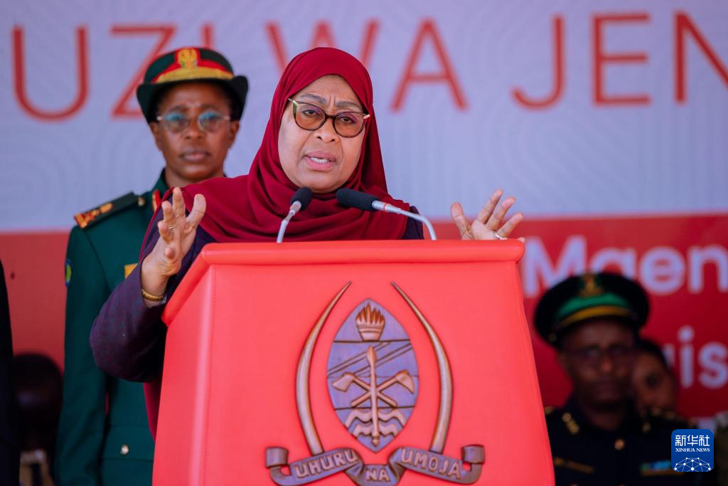 4月5日,坦桑尼亚总统哈桑在首都多多马举行的揭幕仪式上致辞。 新华社发(中铁建工集团东非公司供图)