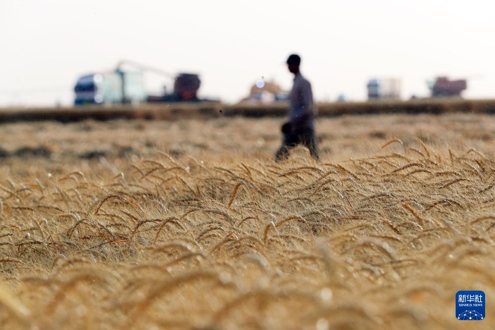 距离埃及首都开罗1300多公里的南部荒漠暖阳高照,无垠的沙海中涌动着金色的麦浪。伴随着收割机的轰鸣,今年第一茬小麦喜获丰收。