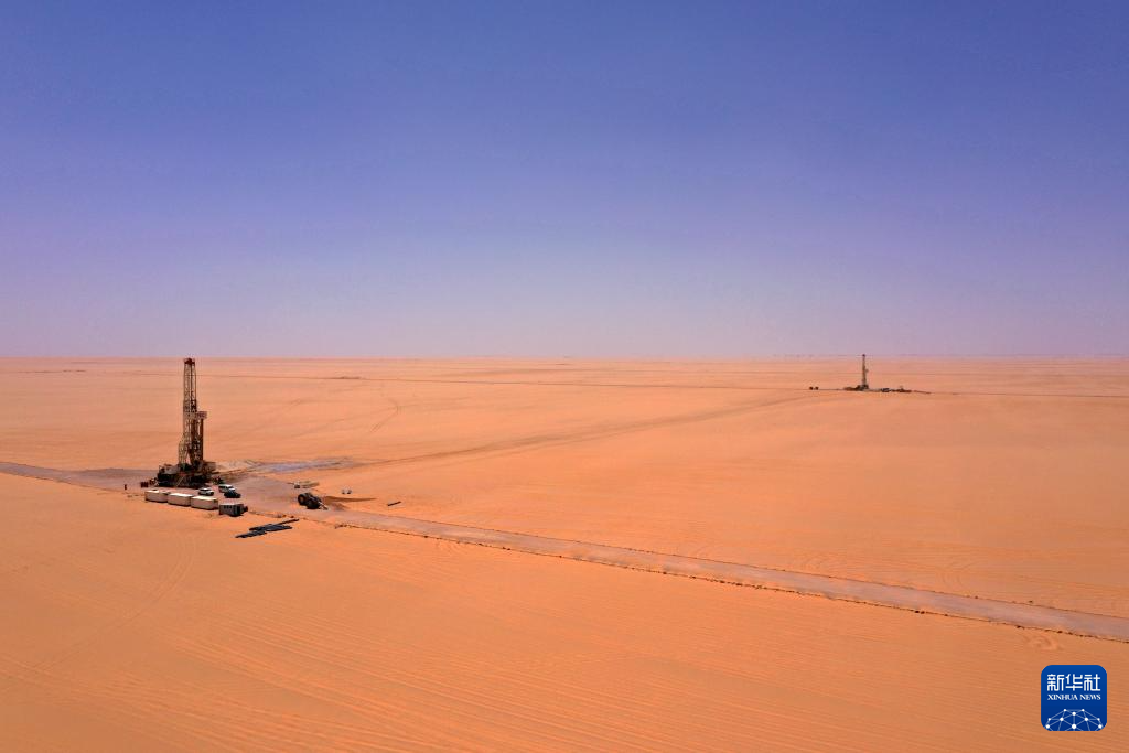 这是5月3日在埃及新河谷省拍摄的中曼埃及公司奥瓦伊纳特水井项目现场(无人机照片)。