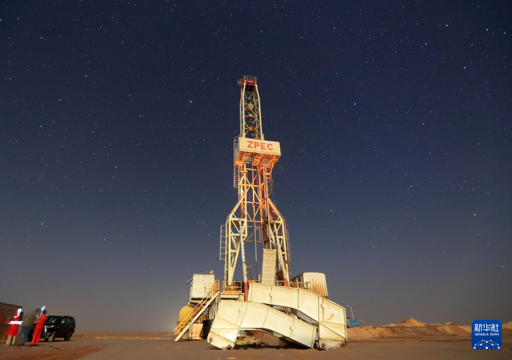 这是5月3日在埃及新河谷省拍摄的星空下的中曼埃及公司水井钻机。