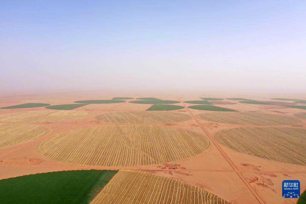 5月3日,收割机在埃及新河谷省的一处农场收获小麦(无人机照片)。该农场的灌溉用水来自中曼埃及公司在当地打的水井。