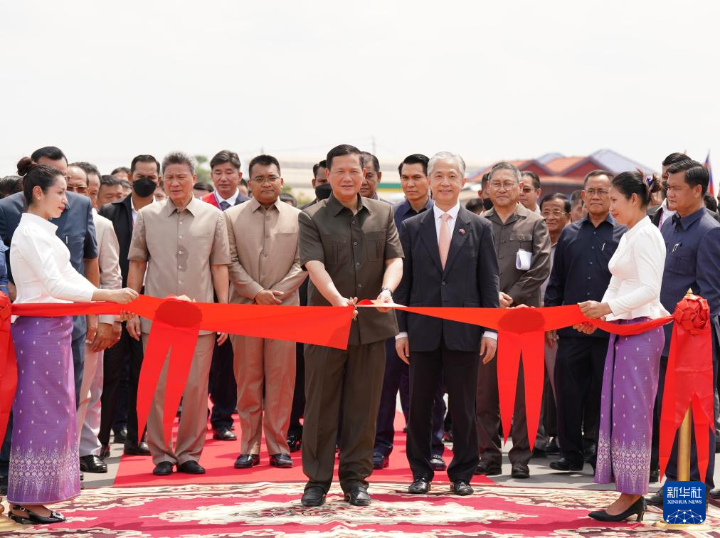 4月29日,在柬埔寨茶胶省,柬埔寨首相洪玛奈(前中)为三条公路升级改造项目通车剪彩。新华社发(尼多拉摄)