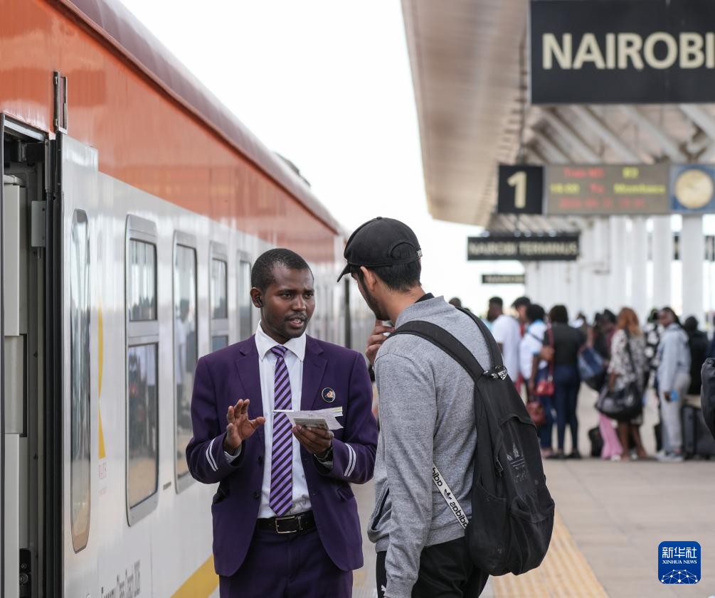5月31日,在蒙内铁路内罗毕站,乘务员为乘客检票。