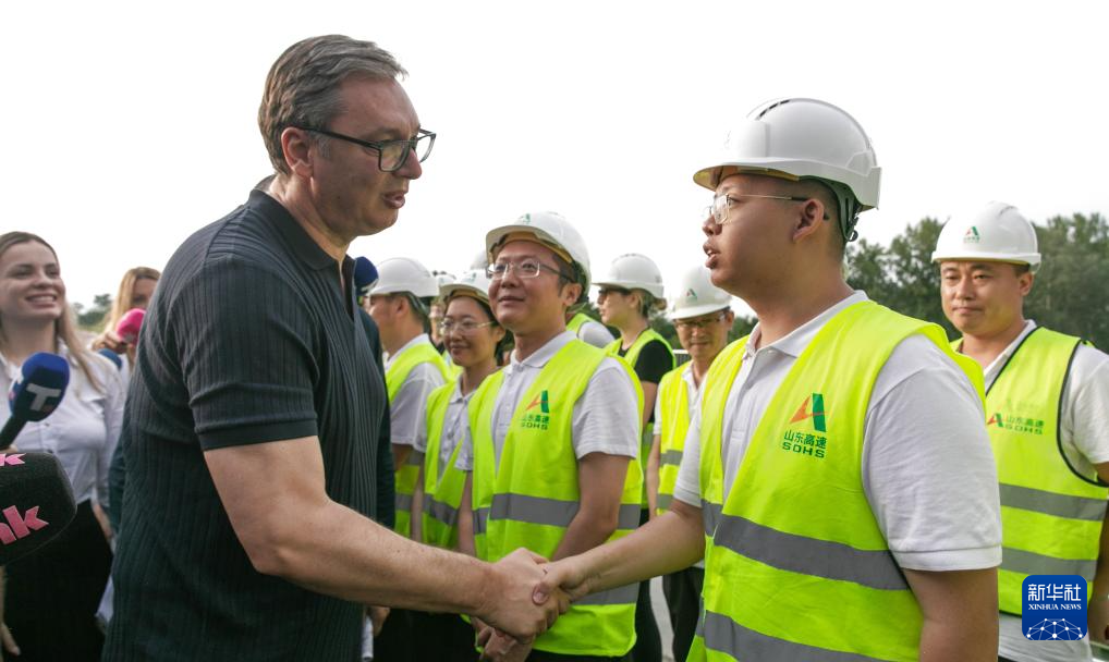 7月26日,塞尔维亚总统武契奇(前左)在戈卢巴茨视察“多瑙走廊”快速路项目时与中方工作人员握手。