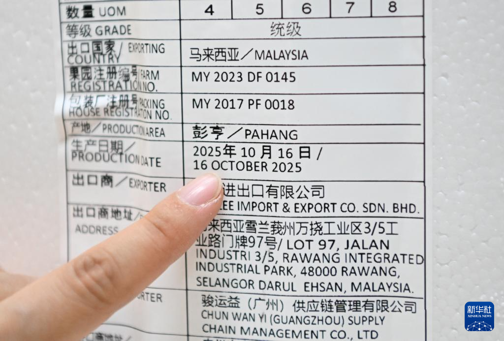 10月17日,在广州白云区一家水果经销商的运营中心,工作人员展示刚到货的榴莲鲜果标签。