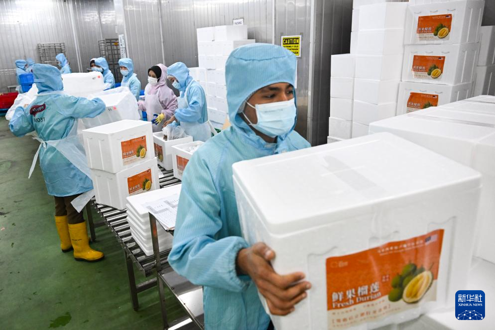 10月16日,在马来西亚雪兰莪州的一家榴莲加工厂,工作人员将分级后的榴莲放入定制泡沫箱,箱内铺设吸水纸与冰袋。