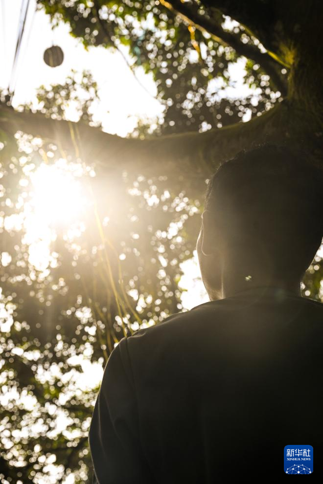 10月16日,在马来西亚彭亨州劳勿榴莲园,榴莲收购商张健豪将榴莲在耳边轻轻晃动,根据果肉震动的声音来判断榴莲成熟度。