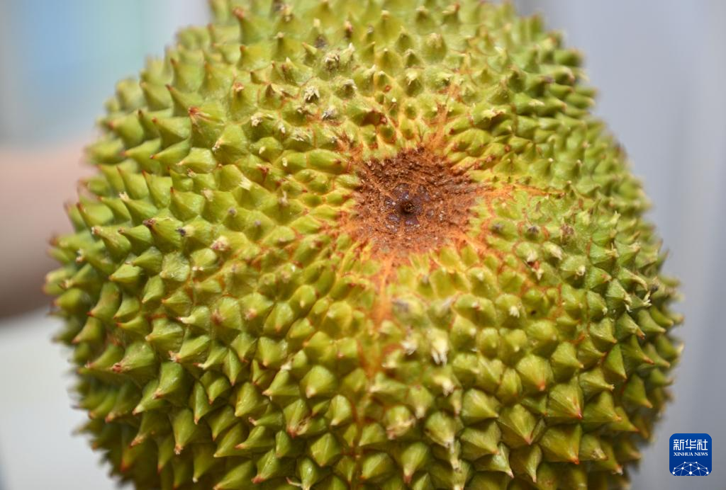 这是10月16日在马来西亚彭亨州劳勿拍摄的一颗成熟的猫山王榴莲,底部有“五角星”形状。