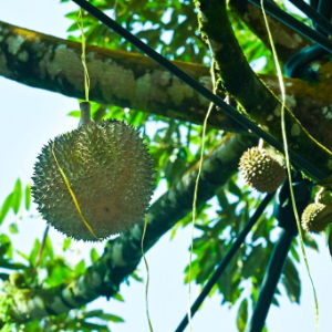 10月16日,马来西亚彭亨州劳勿的一座榴莲园里,园丁将成熟的榴莲缓缓放下。
