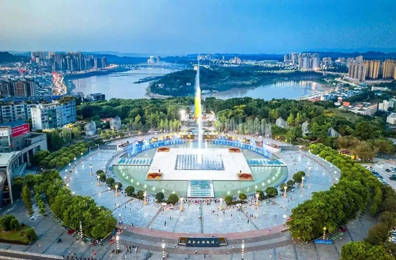 广安思源广场,坐落于渠江之畔、城市中心,为庆祝邓小平百年诞辰而建,是西南地区最大的音乐水景广场,也是市民百姓休闲娱乐的绝佳去处。