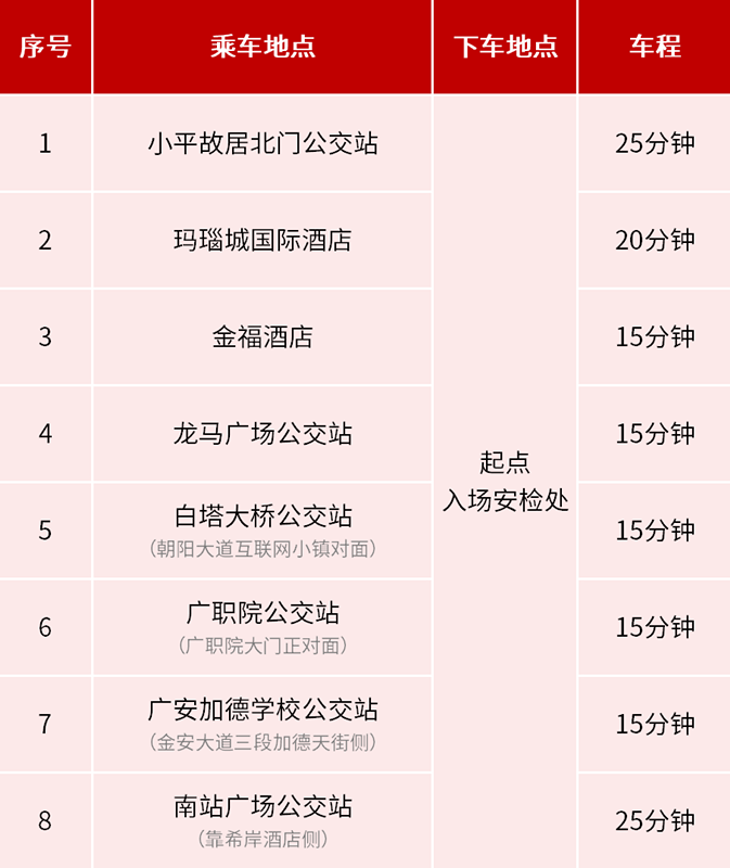 摆渡车仅限广安红马选手本人乘坐,家属亲友不提供摆渡服务。