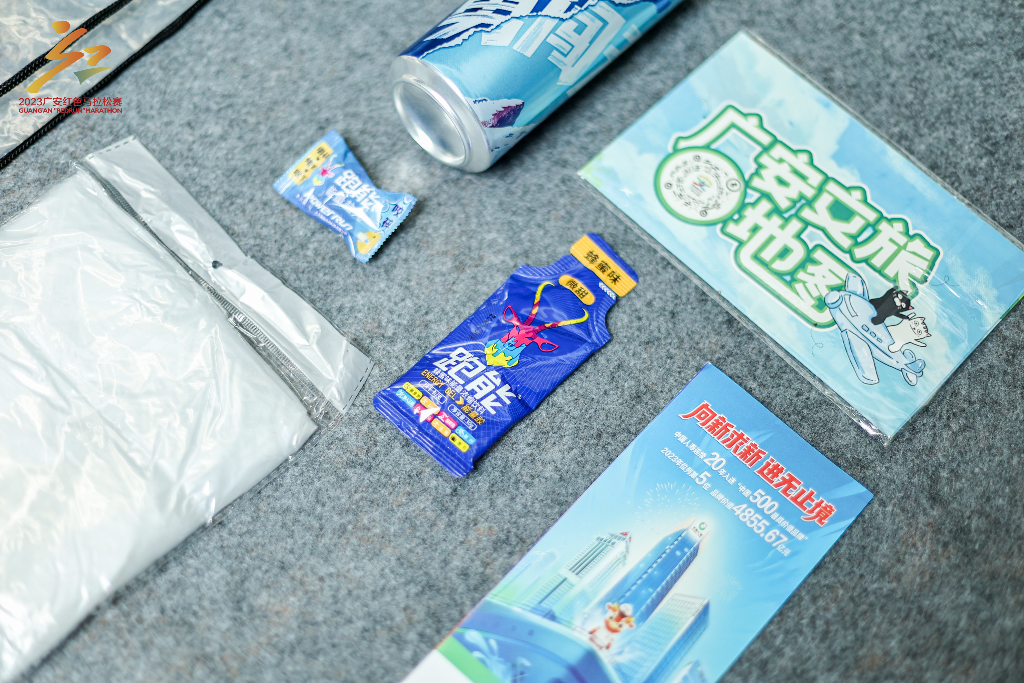 2023广安红马全、半程马拉松项目参赛包里配置了跑能能量胶、能量盐丸。新华网发(光井文化 供图)