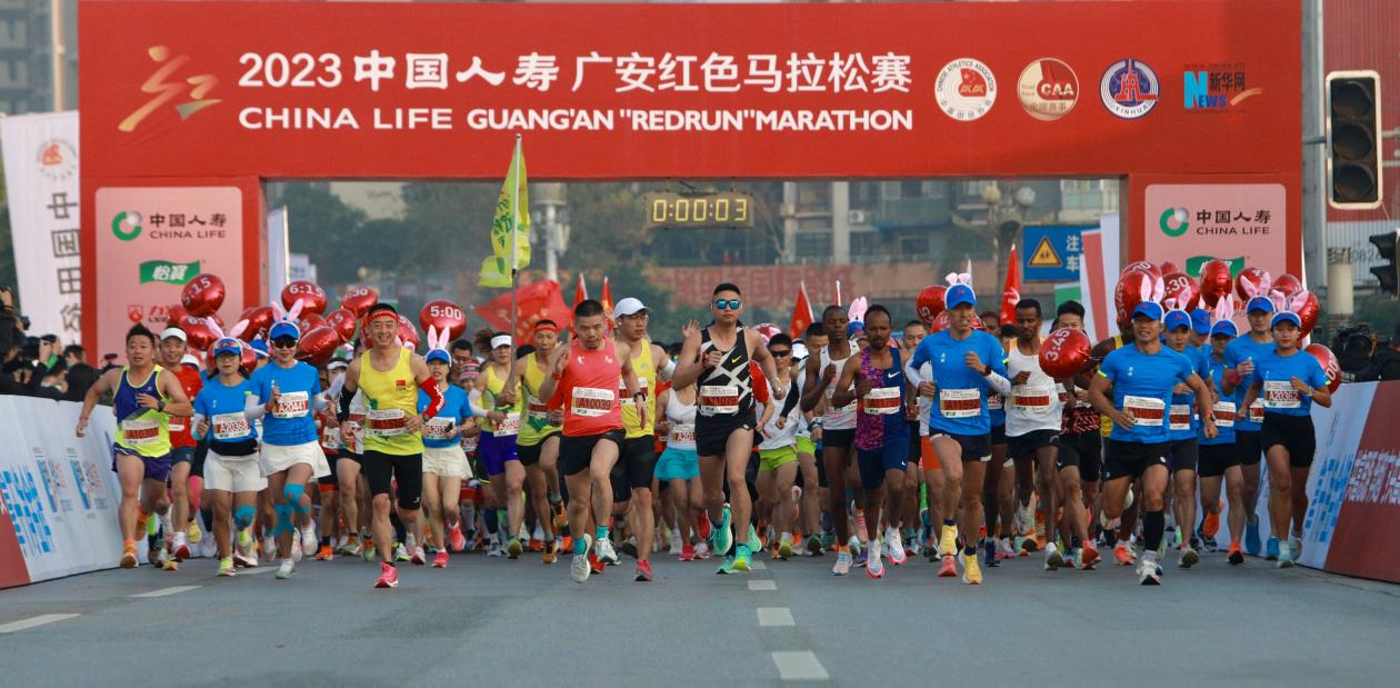 2023中国人寿广安红色马拉松赛出发瞬间。新华网发(张可凡 摄)