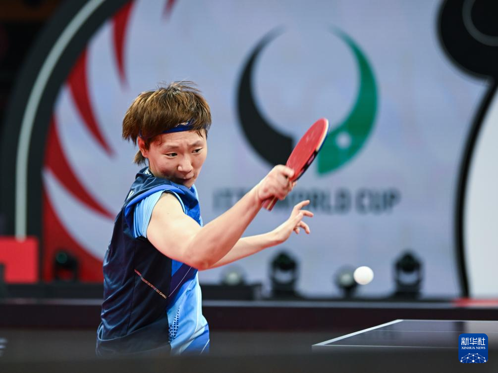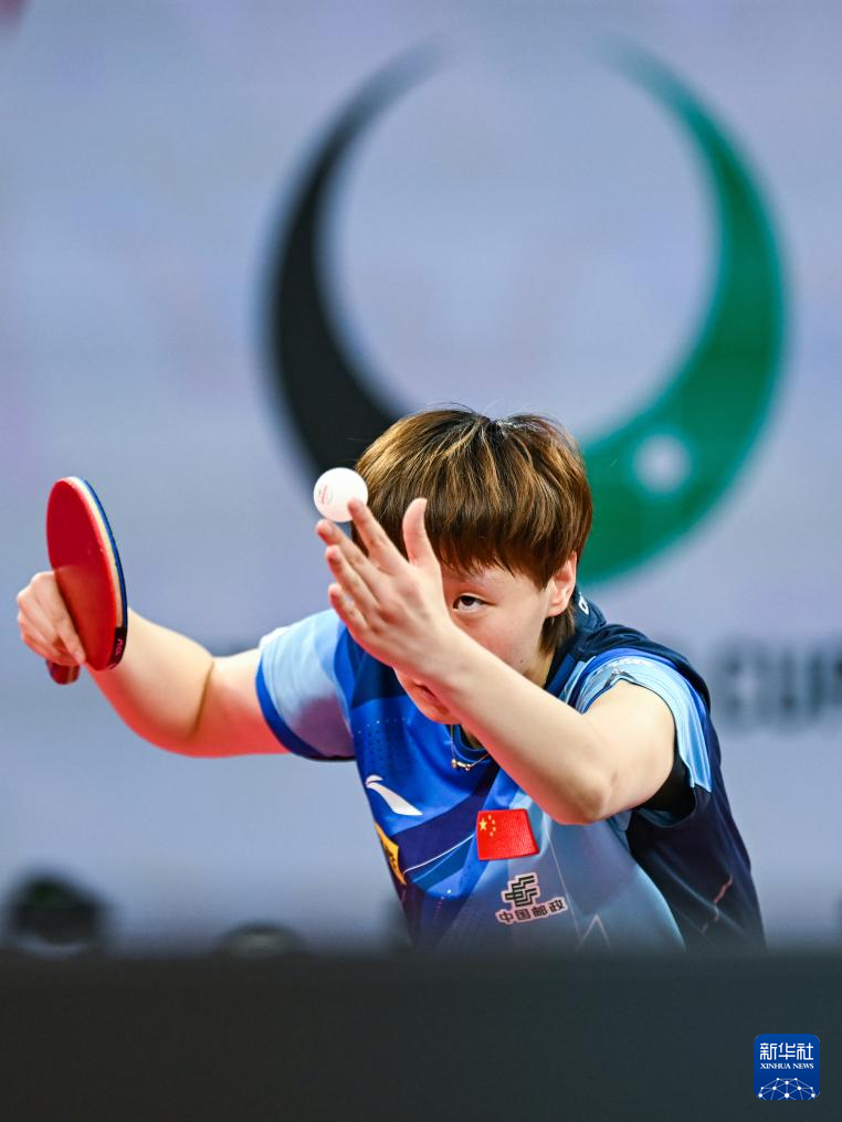 12月6日,中国队选手王曼昱在女单比赛中回球。她以3比0战胜斯洛伐克队选手巴拉佐娃。新华社记者 王曦 摄