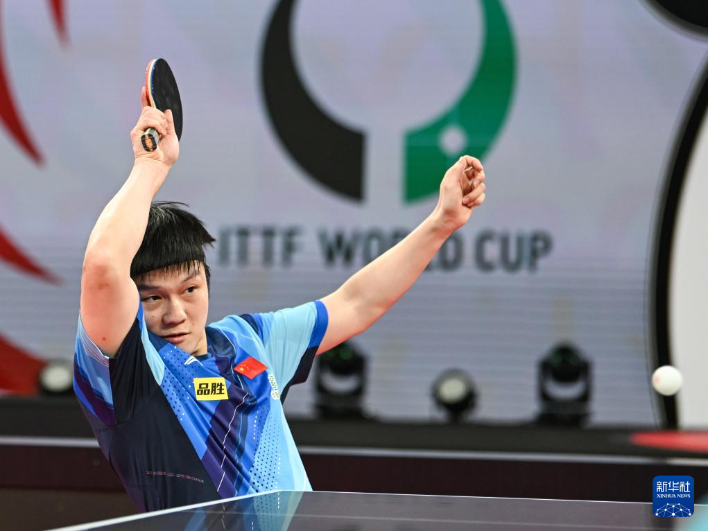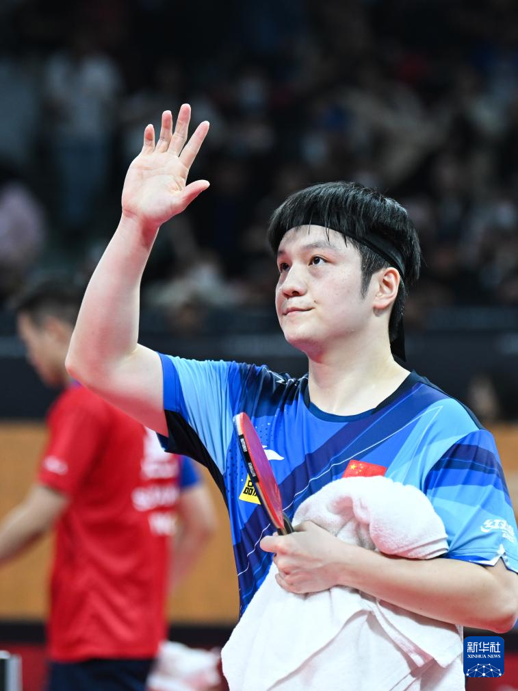 12月6日,中国队选手樊振东在男单比赛后向观众挥手致意。他以3比0战胜斯洛伐克队选手汪洋。新华社记者 王曦 摄