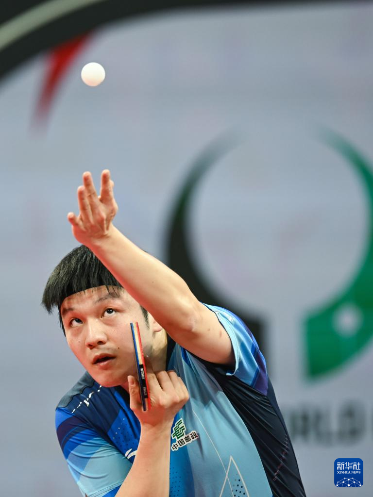 12月6日,中国队选手樊振东在男单比赛中发球。他以3比0战胜斯洛伐克队选手汪洋。新华社记者 王曦 摄