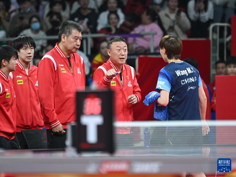 12月6日,中国队教练马琳(右二)在比赛间隙指导王曼昱(右一)。新华社记者 王曦 摄