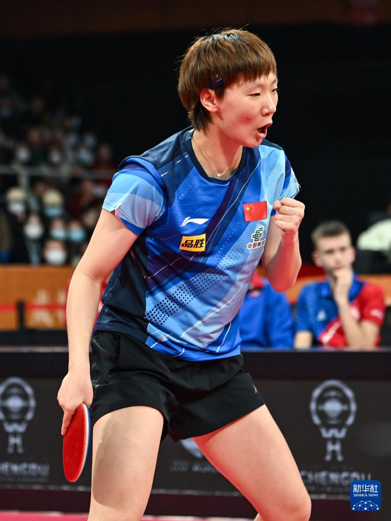 12月6日,中国队选手王曼昱在女单比赛中庆祝得分。她以3比0战胜斯洛伐克队选手巴拉佐娃。新华社记者 王曦 摄