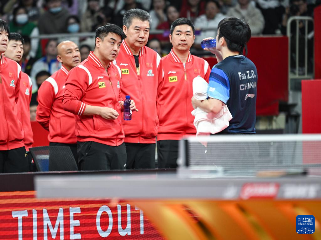 12月6日,中国队教练王皓(右四)在比赛间隙指导樊振东(右一)。新华社记者 王曦 摄