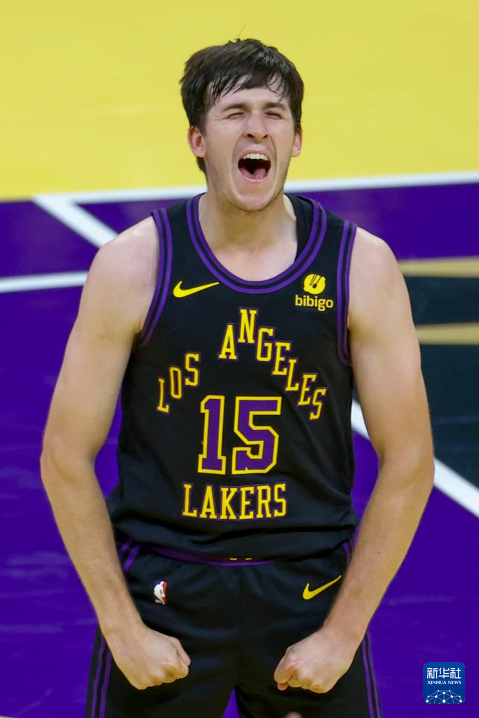 12月5日,湖人队球员奥斯汀·里维斯在比赛中庆祝进球。新华社发(赵汉荣摄)