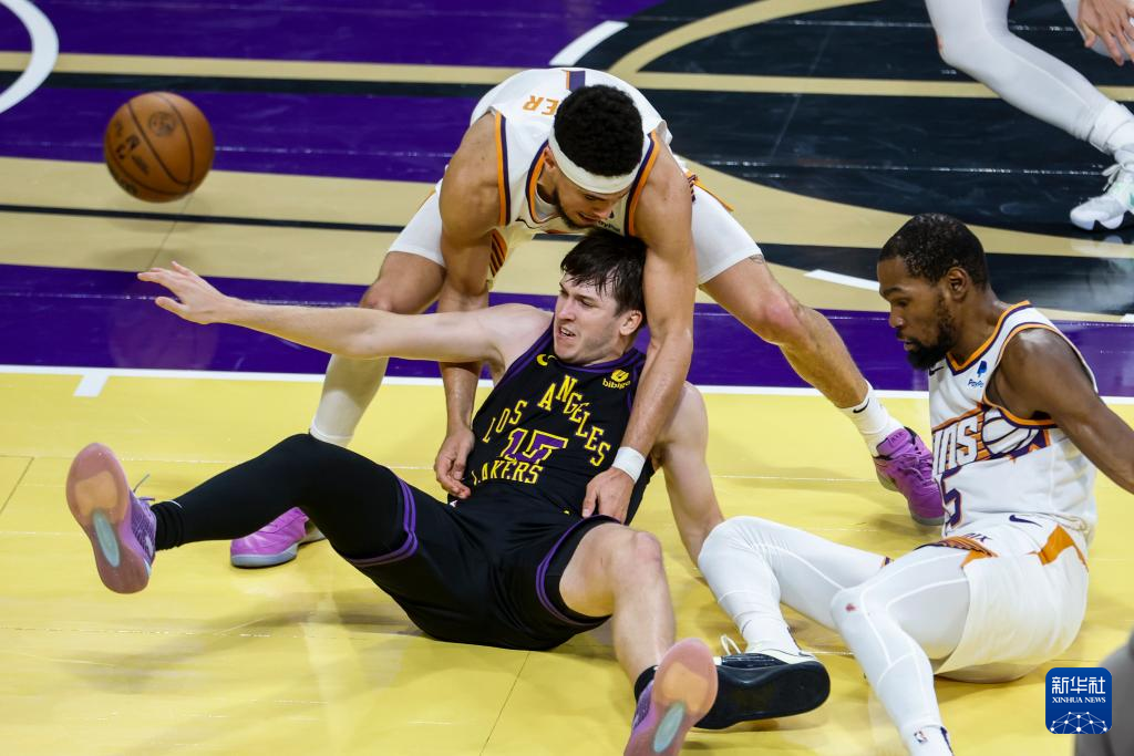 12月5日,湖人队球员奥斯汀·里维斯(左下)与太阳队球员德文·布克 (左上) 在比赛中拼抢。新华社发(赵汉荣摄)
