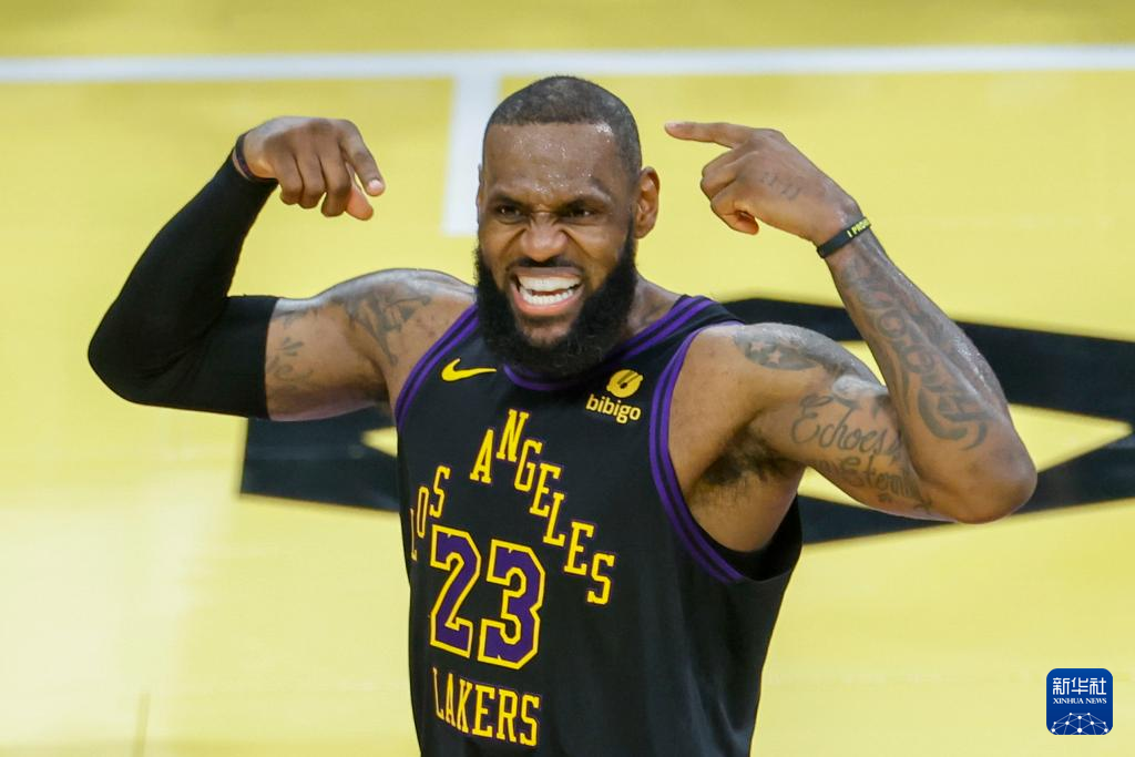 12月5日,湖人队球员勒布朗·詹姆斯在比赛中庆祝进球。新华社发(赵汉荣摄)